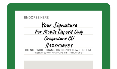 - Fully endorse the back of your check to include your signature, the words "For mobile deposit only", "Oregonians", and your member number: