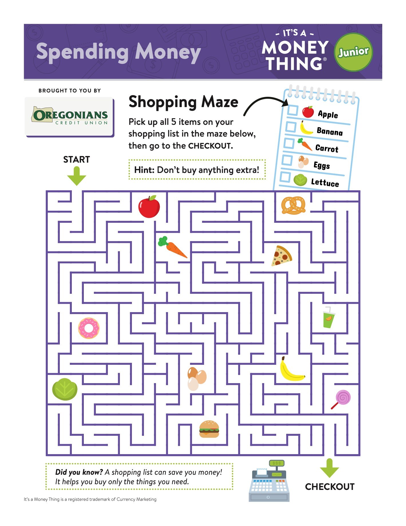 Did you know a shopping list can save you money? It helps you buy only the things you need. Pick up all 5 items on your shopping list in the maze below then go to CHECKOUT.